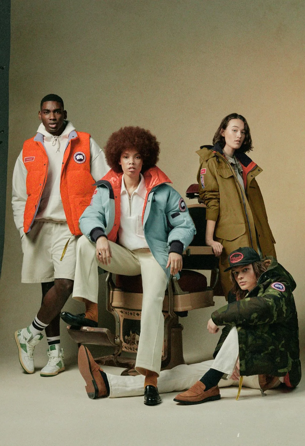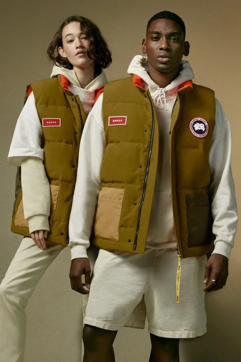 This unisex four-piece collection drew inspiration from the culture and energy of basketball, merging Canada Goose’s heritage with Rhude’s distinct aesthetic. Iconic Canada Goose silhouettes were reimagined through Rhude’s lens, layered with prints, colours, and details that speak to both luxury and streetwear. Distressed camouflage, corduroy collars and cuffs, and the play of bright contrasts against grounded earth tones gave the collection its edge. The result was a set of pieces that honoured tradition while pushing it forward, balancing archival utility with the bold spirit of the court.